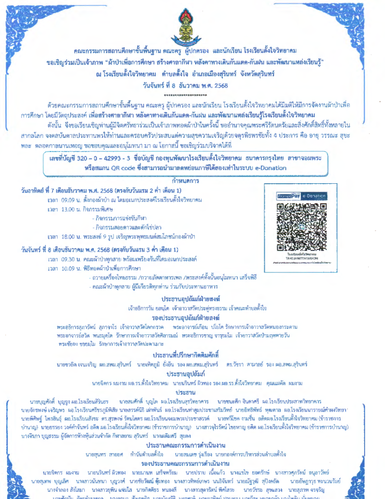 ขอเชิญร่วมเป็นเจ้าภาพ”ผ้าป่าเพื่อการศึกษา สร้างศาลากีฬา หลังคาทางเดินกันแดด-กันฝน และพัฒนาแหล่งเรียนรู้” ธันวาคม 4, 2025ธันวาคม 4, 2025 admin Written by admin